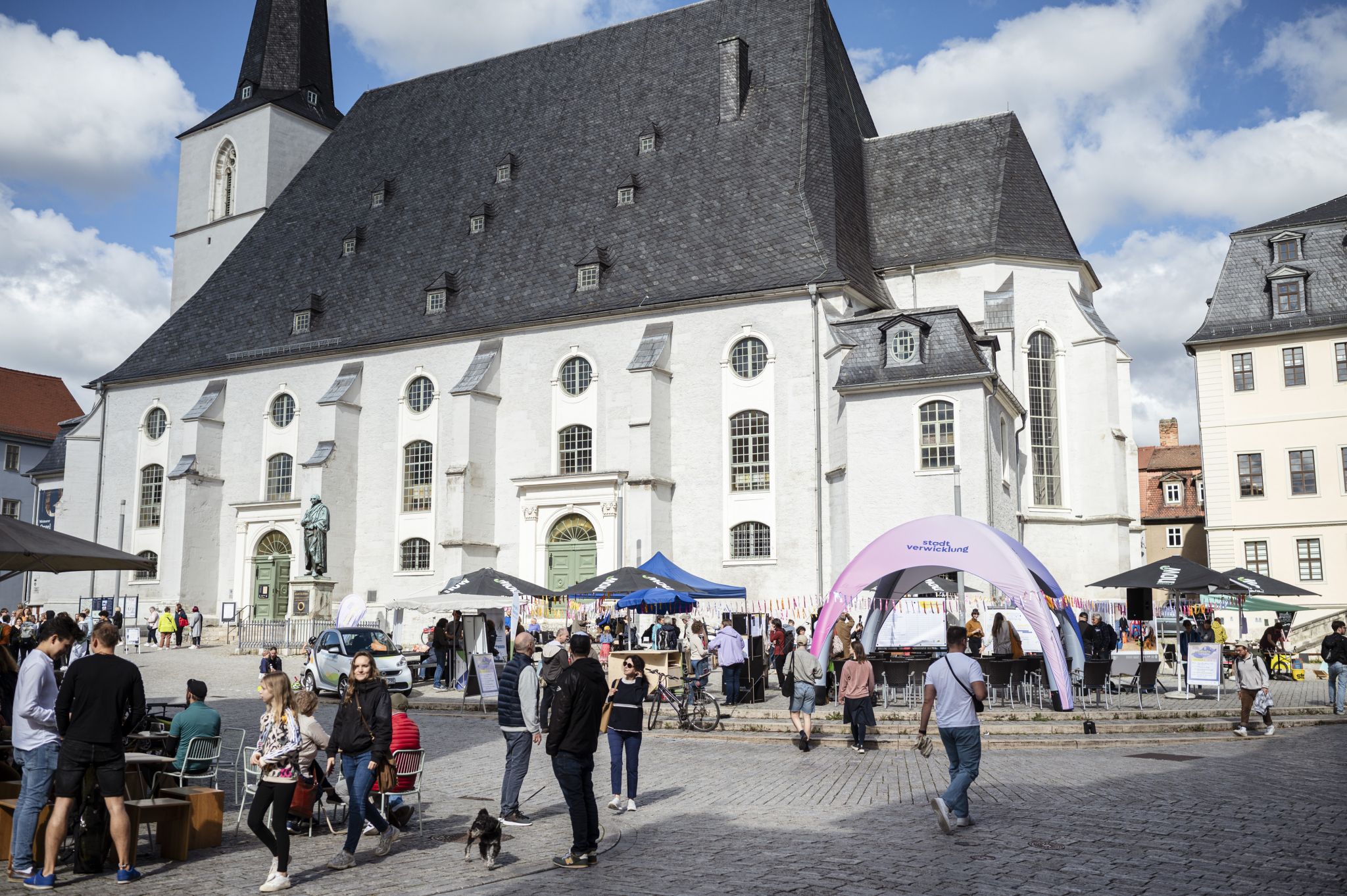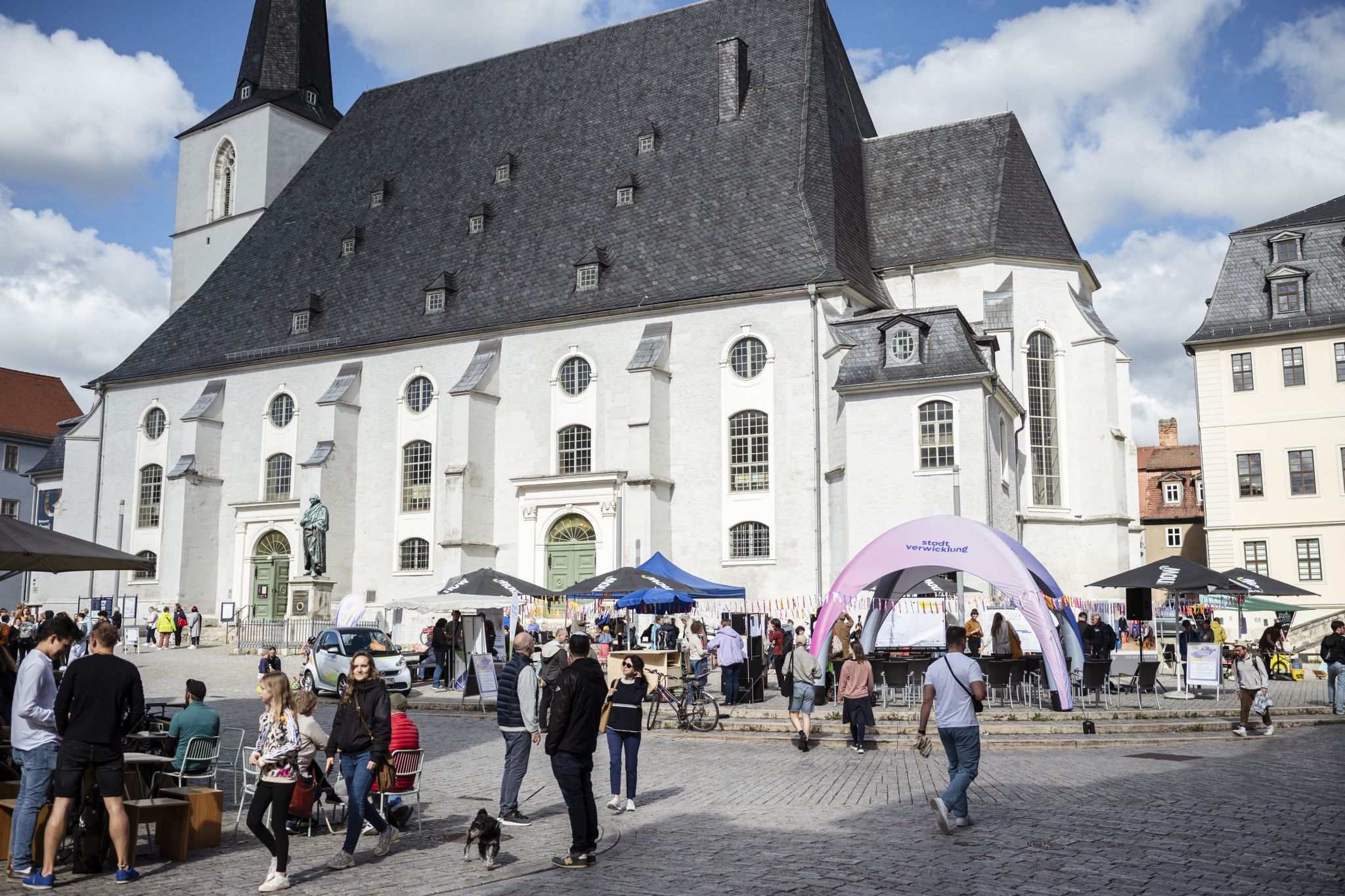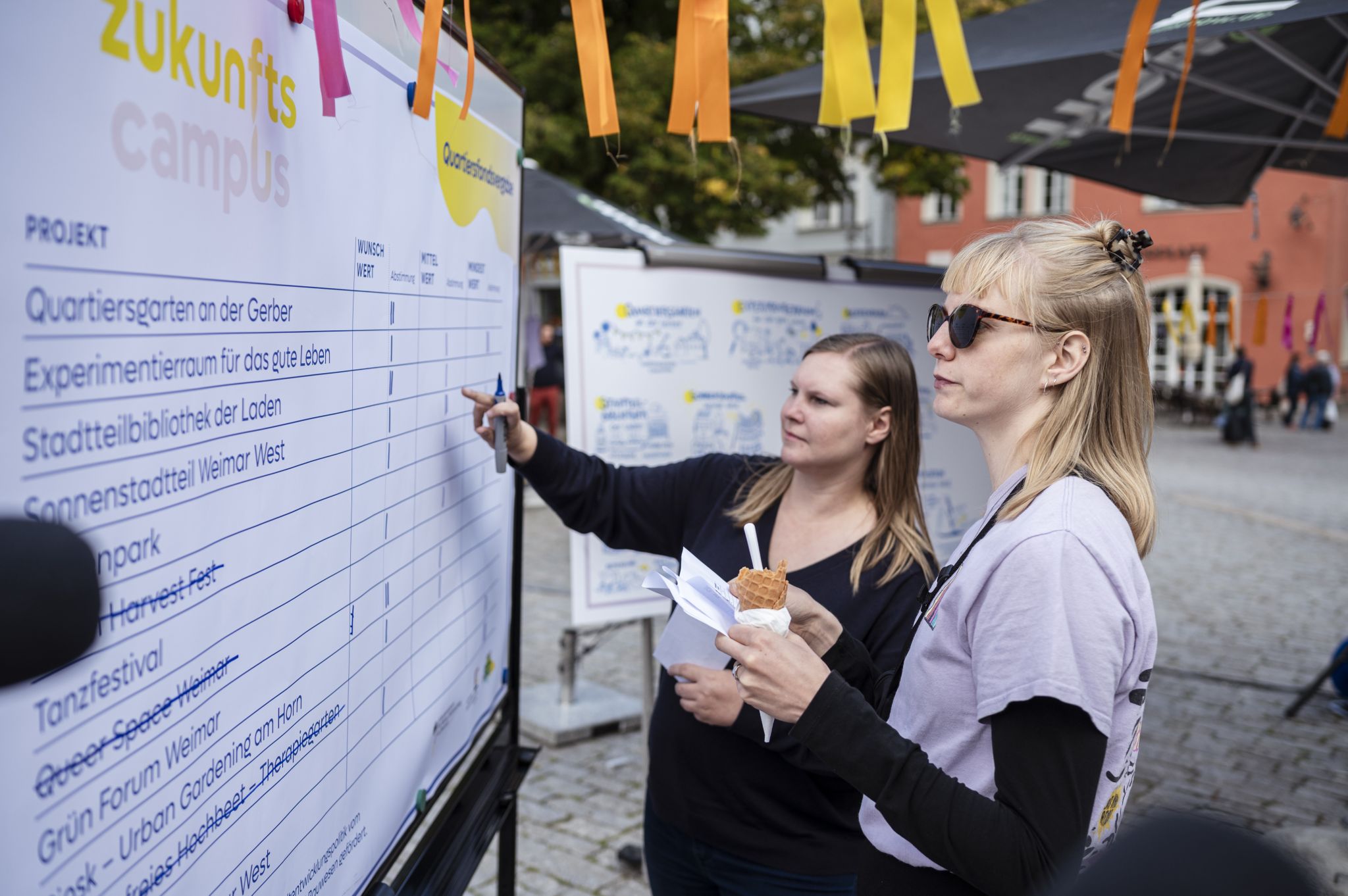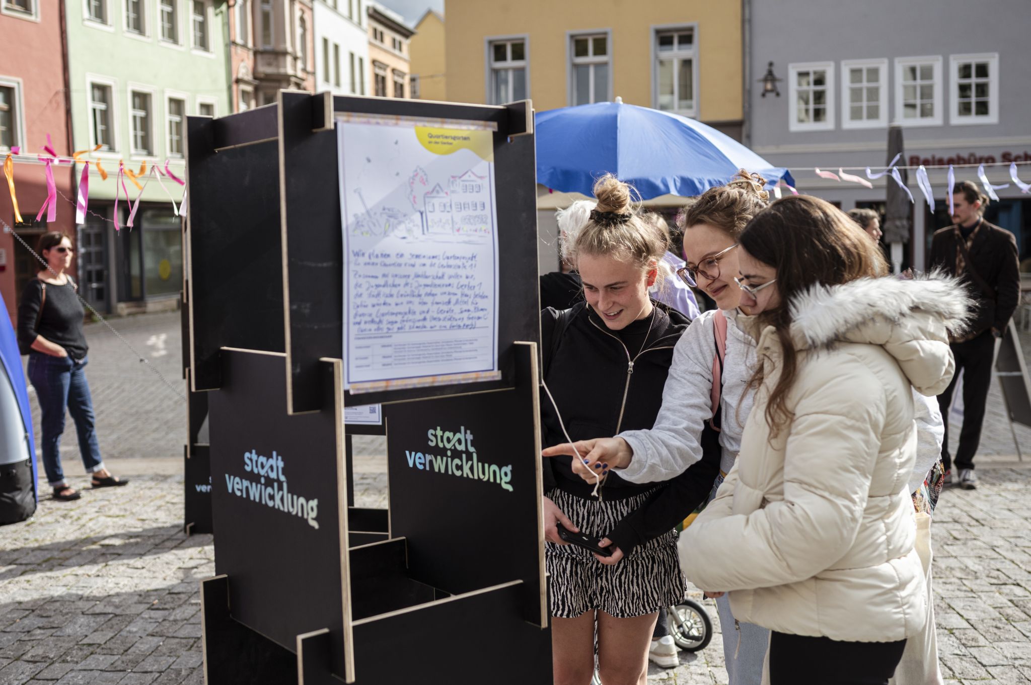 Am Samstag, den 23.9. stellten die Initiativen Ihre Ideen öffentlich auf dem Herderplatz vor. Anschließend wurden die Quartiersfonds in Höhe von 20.000€ direkt an die Initiativen vergeben. Auch das Publikum konnte voten und einen extra Publikumspreis für ihr Herzensprojekt vergeben. Diesen bekam die Gerber, ein Jugendprojekt, das einen Garten mit Hochbeeten für alle anlegen möchte. Ein buntes Rahmenprogramm begleitete die Veranstaltung. So war eine mobile Siebdruckwerkstatt vor Ort und das Wohnlabor der Klassik Stiftung. Eine Ausstellung über Gärten und das Improtheater "Öde und Schiller" rundeten den Nachmittag ab.